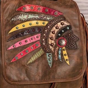 Backpack with crossbody option. Adjustable strap. Brown bomber trim, drawstring, tassels, and fringes on the sides. Large pouch with inside zipper pocket. 15wx14hx5d and strap length 60”. New with tags.