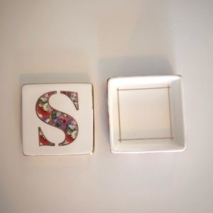 This gorgeous jewellery holder, while small, can add charm anywhere you place it. The lid has the letter “S” with a beautiful floral design within it. The lid is lined with gold paint. Once you remove the lid, you will see a pained gold square inside the box. The bottom half is lined with the same beautiful floral design as seen within the “S”.