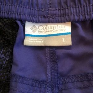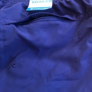 Columbia Regular Nylon Shorts, w/Drawstring Elastic Waist, Two Side Mesh Pockets, One Zipper Pocket In Back. 100% Nylon. Omni Shade Sun Protection UPF 30. Hips Measure 22” across.
