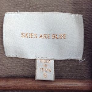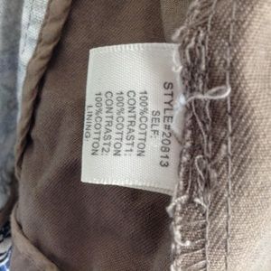 Skies are Blue Boho Floral Print Hooded Utility Jacket. Casual Outerwear. Beige interior attached zip-up hoodie. Buttoned front. Drawstring for cinched waist. Bronze metal beading on drawstrings. Two black exterior fastens around drawstring. Two pockets w/ buttoned closure flap can be worn inside or outside for style. Lined floral print on sleeve & back.