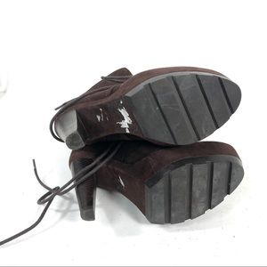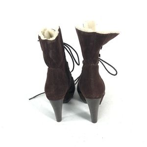 Coach brown suede leather platform stiletto winter boots tie up with shearling linings. They can be worn mid calf or rolled over for ankle boots. They are a brown color with red undertones. General wear on the suede and scuffs on the toe. Women’s size 8