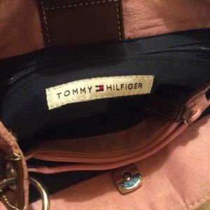 Tommy Hilfiger pink Swede handbag with brown trim. Snap closure. 10 x 12. In EUC