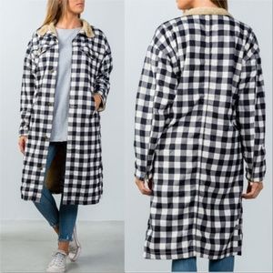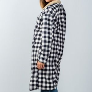Features a cozy longline design, lumberjack plaid, faux fur lining, flat collar, long sleeves, flap breast pockets, side pockets, and button up front closure. 100% Polyester