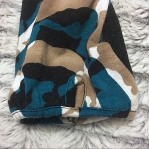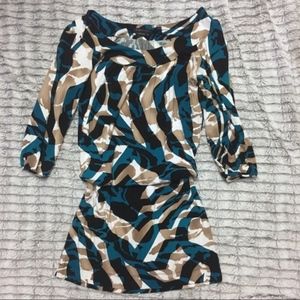 BCBGMAXAZRIA TEAL BLUE GREEN TAN CAMOUFLAGE PATTERN MINI 3/4 SLEEVE SOFT AND STRETCHY CUTE COCKTAIL DRESS IN XS / VERY GENTLY USED / EXCELLENT CONDITION
