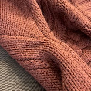 Adorable, warm and stylish! Large neck hole allows for over-the-shoulder or one-shoulder look. Boxy frame for loose and casual fit. Drop shoulder seams. Super cute sweater!! On-model photo is best color representation—it’s more of a dusty pink and not as orange as photos appear. Very minor pilling and fuzzies throughout. Small snag on back and loose thread on sleeve, shown in photos. Warm and soft. Great used condition!