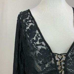 Topshop women’s coverup caftan in black. Long sleeves with open slit on side and black mesh floral embroidered detailing. Corset like closure on front. Size medium