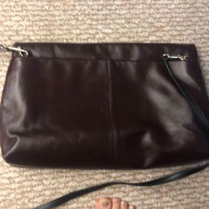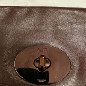 Gorgeous leather burgundy (coach calls the color oxblood) envelope clutch with attached black leather handle. Rose-colored lock. Inside is fabric. Very roomy. Worn 2x.