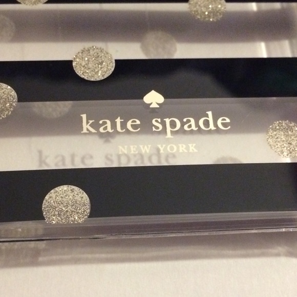 Colors: black & glittery gold. Print: stripes & dots. Phone compatibility: iPhone 6+, 7+, 8+. Brand: kate spade (authentic). Pics show scratched-up areas. *5th pic* shows a 📦 confirming the📱compatibility.
