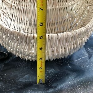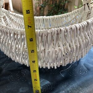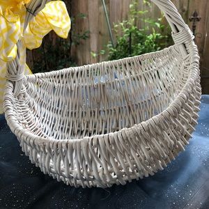 Very UNIQUE White Egg Shaped Basket with handle and Yellow Bow. Looks like a gathering basket, has a rounded bottom. Wicker basket has been painted white.