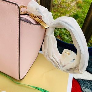 Beautiful pink blush color leather satchel bag has 1 big compartment.