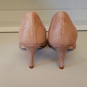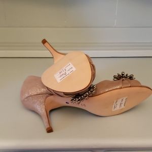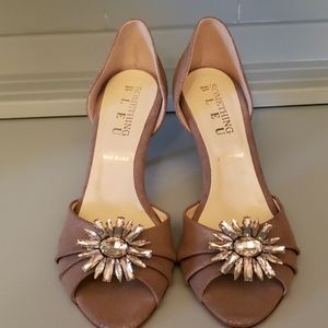 Beautiful and classy peep toe heels. Embellished gem flower on each shoe. Color on the box is listed as champagne metallic, which shows as shiny/glittery. 3 inch heel. Would be a beautiful wedding shoe!