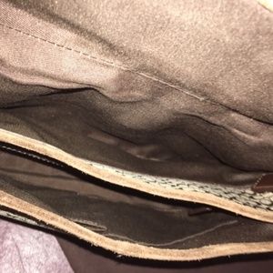 Brown and Tan . Leather and suede. Height 6.5 X Length 12" X Width 2.5" Very clean