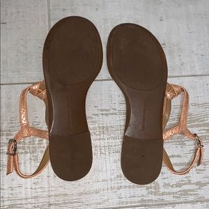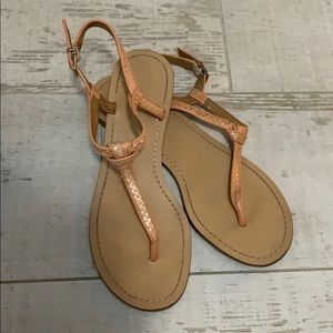 Pretty light pink colored straps with snakeskin detail. Perfect neutral sandal. No size on them (must’ve worn off) but I think they’re a 9. They’re approximately 10” long. Adjustable straps.