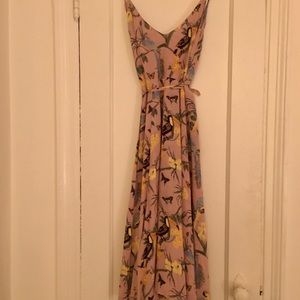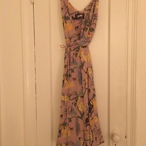 This is a midi length, wrap dress with a high slit and adjustable straps.