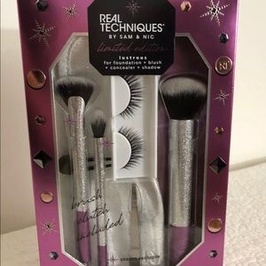 Real Techniques Limited Edition Brush Set With Eye Lashes, Tweezers And Bag. Real Techniques Limited Edition Brush Set With Eye Lashes, Tweezers and Brush clutch. Includes RT 428 precise fan brush, RT 330 soft shadow brush, RT 204 buffing brush, RT lashes, RT tweezers and RT brush clutch.