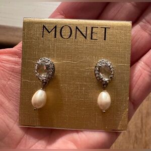 Beautiful drop style pierced earrings by Monet. Purchased at Macy’s but never worn. Lovely, clear CZ stones, one large stone four prong set, with smaller stones around the periphery. A faux, ivory pearl dangles. Measures just about an inch long. They are much prettier in person!! Retails for $30.