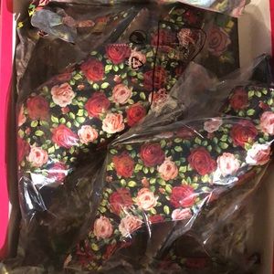 Betsey Johnson Rexie Shootie Peeptoe Heel. Vibrant red & pink roses with leaves put a fun twist to dressy looks in the black-tie Rexie stiletto 4-1/4" heel. Round-toe shooties with back tie closure. Manmade upper; manmade sole. Imported. Size 7.5 NIB.