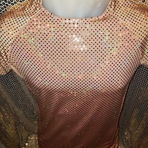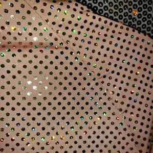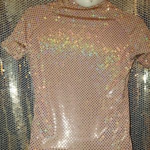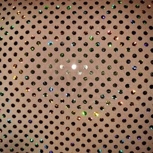 Flesh color stretchable fabric with Aurora borealis laser dots all over. This was made for a very, very well known Las Vegas entertainer and their back up dancers. This is a sample shirt. Fits muscular and Athletic best, as it is made to be flexible when moving. Custom couture and one-of-a-kind.