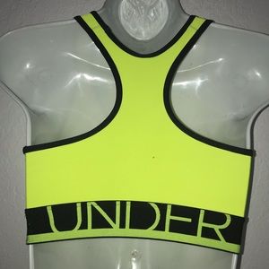 Stretch neon yellow green Racerback sports bra. Logoed band. 24 in before stretch Front 6 in down the middle.