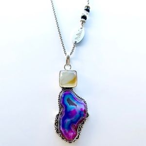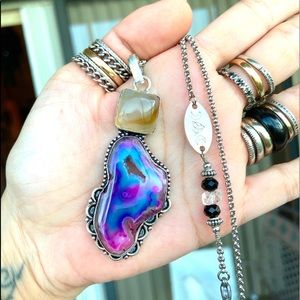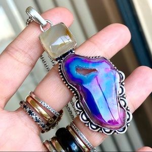 πFREE GIFT WITH EVERY PURCHASE OVER $25π Solid 925 Sterling silver gemstones boho stone pendant ( 925 stamp on the back )Comes on a 20 inch stainless steel chain black crystal and one herkimer diamond . Steel brand logo two moons & celtic triquetra knot . ( If you need a different size chain just lmk )ONE OF A KIND ! Genuine pink purple druzy agate . Gem , gift / Stylish ,fashionable , valentine , anniversary , gems , trendy ,chic , accessory , big charm , bohemian, natural healing stones .