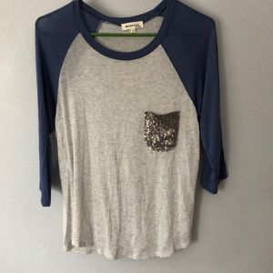 Gray and medium blue raglan top w/silver sequin pocket. Says size XL but fits like a small. Super super stretchy! A bit see through. Length from top hem to bottom -24in.