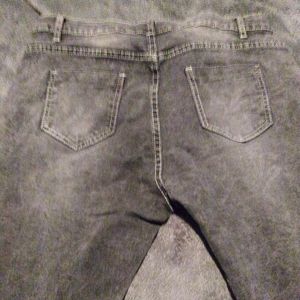 5 pocket jeans with distress on front legs.