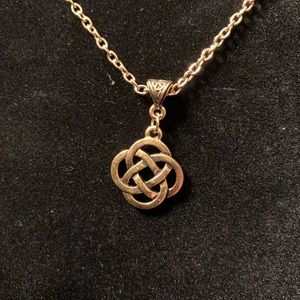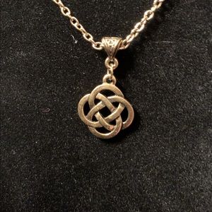Celtic Knot Necklace: Beautiful Gold plated pewter Celtic Knot Pendent is ¾” diameter, bail has beautiful Celtic design. Gold toned neck chain is 18” long.