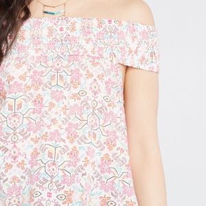 A smocked off-shoulder neckline, breezy woven fabric, and a colorful floral print with the appearance of embroidery.