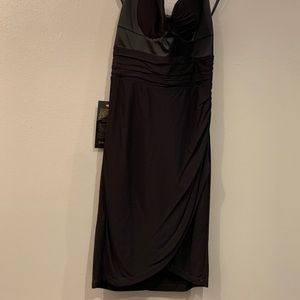 NWT! Beautiful, never worn, Bebe bodycon dress with satin details. Runs small. Lined. Viscose/polyester