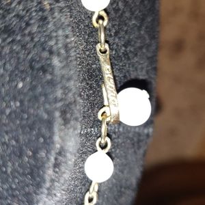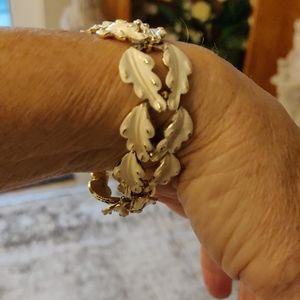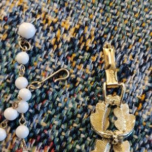 Cream color enamel over gold metal leaves. 12 articulated leaf segments with white bead extensions at either end. Hook and ball closure. Can be worn smaller than 18" if desired. Matching bracelet has 10 segments, foldover clasp.