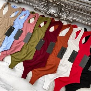 Extremely stretchy & one size fits all. Solid not sheer. Great for layering or pair this with your favorite jeans for a quick seamless outfit. Side shaper included to give you an hourglass figure. Racer neckline & thong bottom