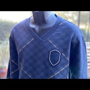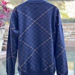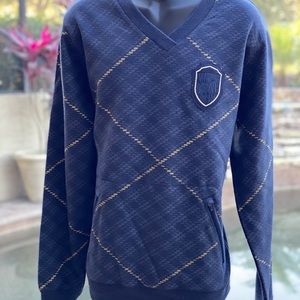Fleece sweatshirt style neck with zippered kangaroo pockets in a blue argyle pattern. Measurements L-23”chest 23” arm 28” length XL-25”chest 23” arm 30” length.