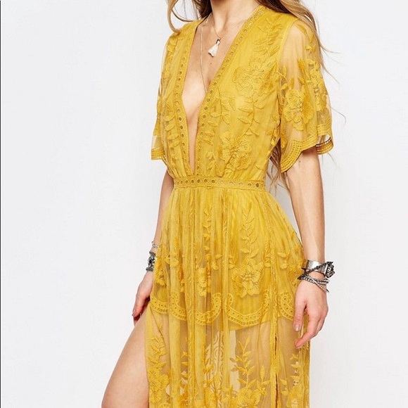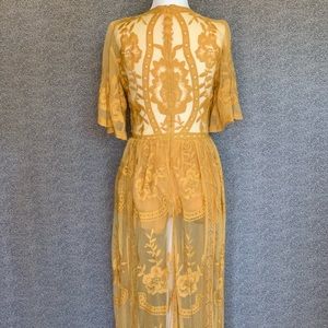 Stunning Honey Punch marigold lace maxi dress. Deep V neckline, intricate lace details.