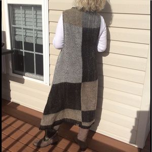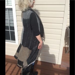 This is GORGEOUS!! it is a Color block Boho Cardigan Sweater Vest. Full Length. One Size. Has a great Open swing. A blend of Black, Tan & Gray so it matches everything. Look trendy and stylish while bringing your cozy blanket Vest w you.