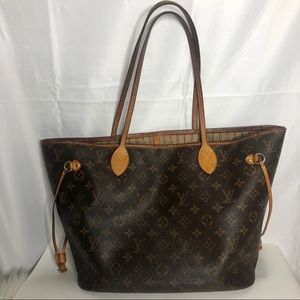 100% Authentic classic LV Monogram Neverfull MM. Has been very loved. Date code is MB3150. Made in Paris. Fits a ton- great for travel/work. Over all has vintage wear. Patina handles and trim has darkened. Trim has wear, inside is not pristine. Pocket is ripping. This is a preloved bag. Corner wear. Side straps have been replaced.