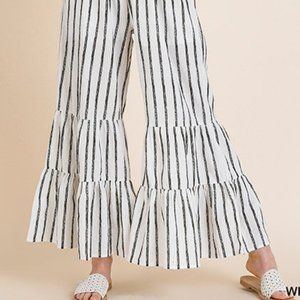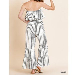 UMGEE White Black Striped Boho Ruffle Strapless Wide Leg Jumpsuit Jumper with sash belt at elastic waist. Made of soft high quality cotton material. Brand new with tags.