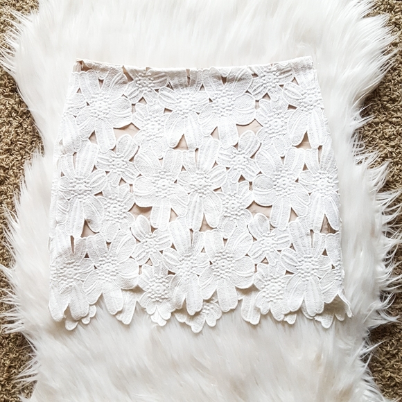 White floral lace mini skirt with a hidden side zipper and nude lining. In good used condition with no rips or stains. Size M/L.