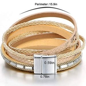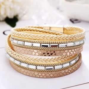Features: Multilayered Vegan/faux leather bands. Rhinestones & magnetic clasp