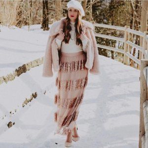It is a maxi skirt by Eva Franco for Anthropologie with beautiful rose gold sequins on a blush base. A sheer tulle overlay topped with sequined stripes makes for a particularly charming, event-ready skirt.