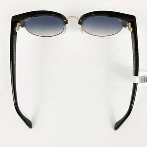 Clubmaster style sunglasses with bold cat-eye top line. Shiny black acetate front and temple. Shiny metal rims and logo. Gradient smoke lens. 100% UV protection. Made in Italy.