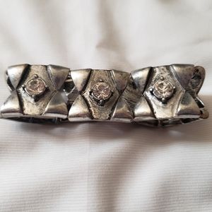 “FINAL MARKDOWN” Stylish silver and rhinestone Bracelet. Perfect condition. I have had this bracelet for 4 years without tarnish. Not sure who made it, but what i do know it doesnt turn my skin green. Lol. Awesome piece goes with almost anything. Braclet stretches to fit most wrists