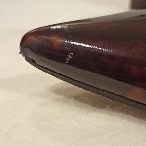 Tortoiseshell Patent-Leater Bootie. 2 inch heel. Minor scrap on right tip of boot. Small scuff on side of right boot and on side of left boot. In good condition.