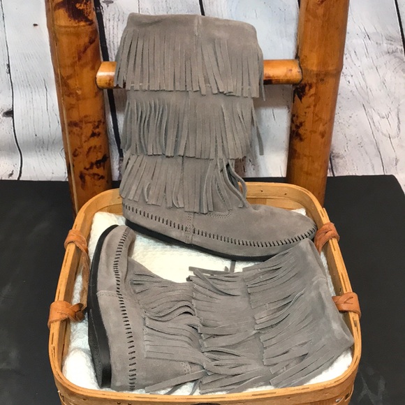 NWOT Minnetonka Gray 3 Layer Fringe Leather Boots. Our most popular fringe boots are an instant classic. The three layers of suede fringe wrap all the way around, swaying with your every step for a little flirty fun. These suede leather boots meet you mid-calf. Slip them on for dancing, concerts or a quick and easy fashion statement.