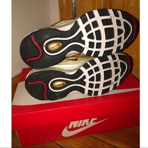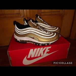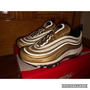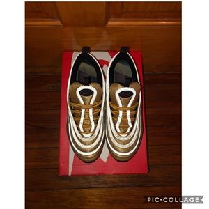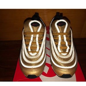 Hard to find Nike air max 97 sneaker, these sneakers are in boys size 7, has only been worn once as you can see from pic they are pretty much brand new, box included, metallic gold in color, sneakers are 8 1/2 in women size which is a 7 youth boys size