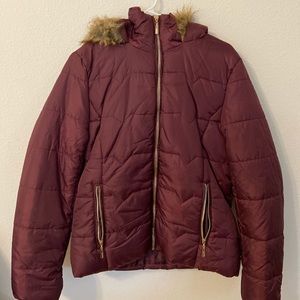 Burgundy puffer coat. Hood lined with brown faux fur. Gold hardware. Tag still attached. Never worn.