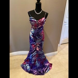 Stacy Sklar Multicolored mermaid gown ruched from the chest down throughout the hips. Open slit in front for easy walking. 49” from armpit to hem. Invisible zippered closure in back with ruching from top to hips. Worn only 2 times then dry cleaned and placed into garment bag.