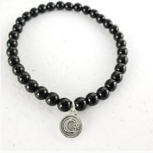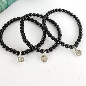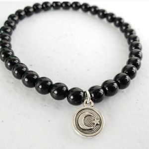 Genuine black Jasper stone beads 6mm in size with a double sided silver plated crescent moon and star charm. Strung on thick stretch cord for durability. Multiple sizes available.