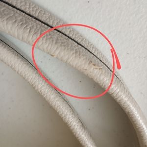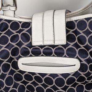 Comfortable nine west bag, magneto closure design, two zipper design that open in the front of the bag, a pocket in the back. Chest of drawers inside with several compartments and a zipper pocket inside. It only has a small damage that is marked, for greater security see the photo marked in red please