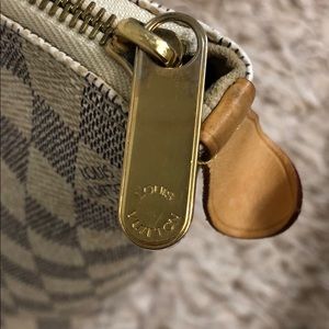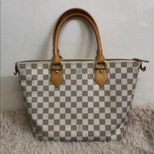 Authentic Louis Vuitton Damier Saleya PM. Clean, minimal pen marking to ivory suede interior. No exterior scratches. Very well loved and used only on special occasions. In great condition with some signs of wear and previous use but still has a lot of life. Slightly worn corners, no creases on leather handle and only end of zipper hand is tarnished as pictured.