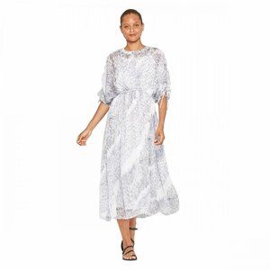 This Printed Elbow-Sleeve Crewneck Midi Dress from Prologue helps you channel effortlessly chic style whether you're headed to a wedding or any special occasion. This dress has a printed sheer overlay with a subtle abstract design for just the right touch of style. Cinched elbow-length sleeves add texture and dimension, while the cinched waist creates a flattering silhouette. With a flowing and breezy fit that moves beautifully, this printed midi dress is the
